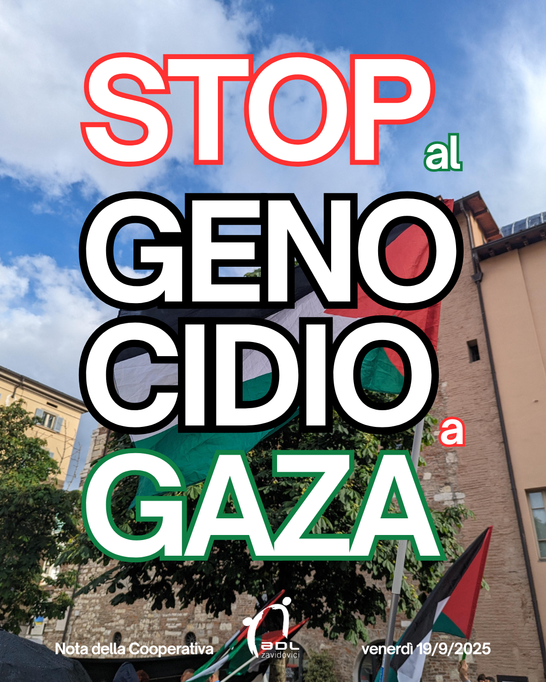 Considerata l’estrema degenerazione della situazione a Gaza, la propagazione senza fine del massacro di civili affamati, la notizia della commissione indipendente ONU che, con 72 pagine di prove, conferma che lo stato di Israele sta compiendo quattro dei cinque atti genocidari elencati nella Convenzione sul Genocidio del 1948, la nostra cooperativa sostiene la mobilitazione generale e gli scioperi indetti per oggi venerdì 19 e lunedì 22 settembre in solidarietà della popolazione di Gaza e, con essi, il sostegno alle persone socie e lavoratrici che intendono mobilitarsi.