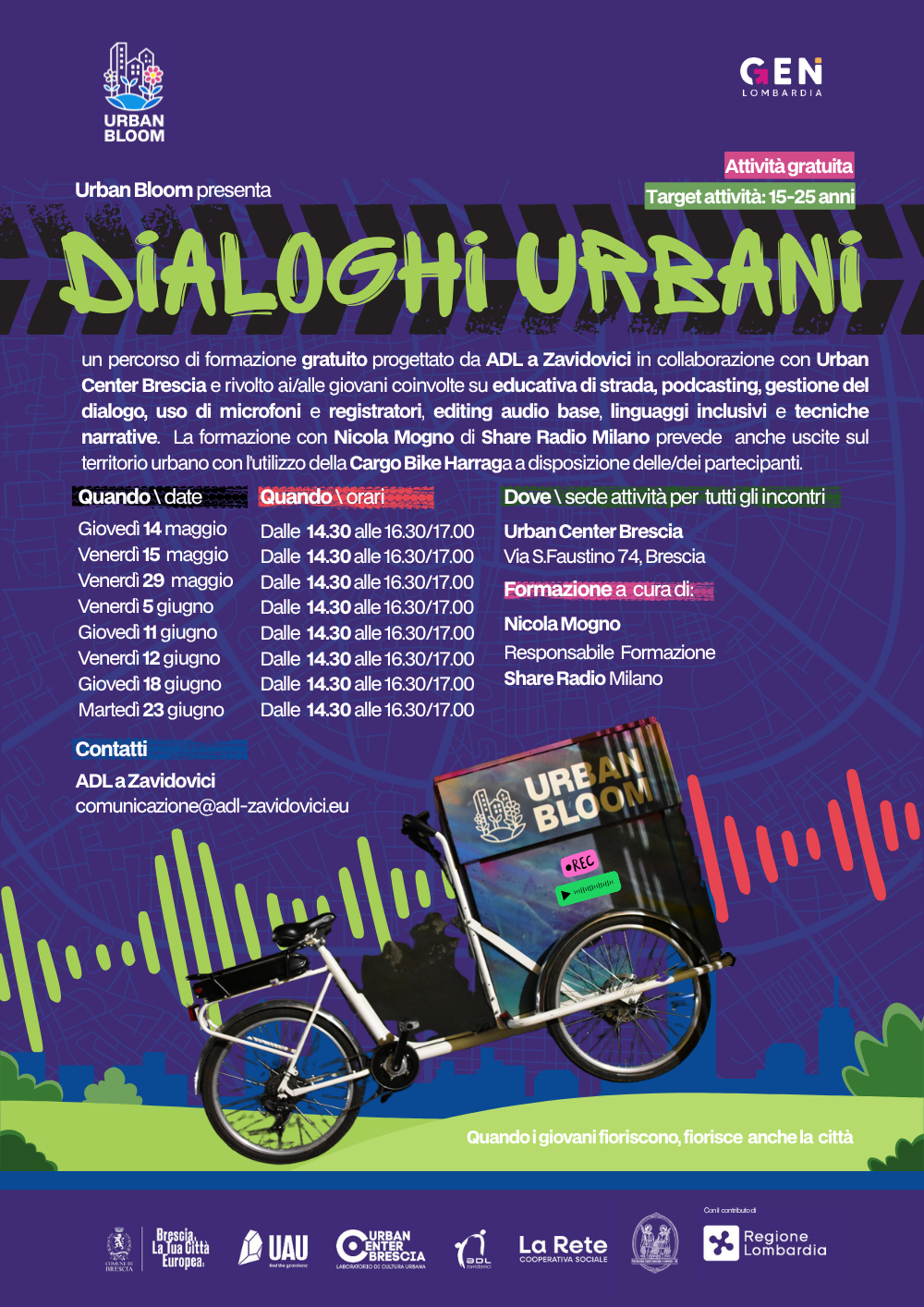 Un progetto sperimentale di educativa di strada che coinvolge un gruppo di giovani formati sui temi dell’educativa di prossimità, della webradio e del podcasting, che si muovono per il centro di Brescia a bordo di una Cargo Bike attrezzata come studio mobile leggero, accattivante e riconoscibile