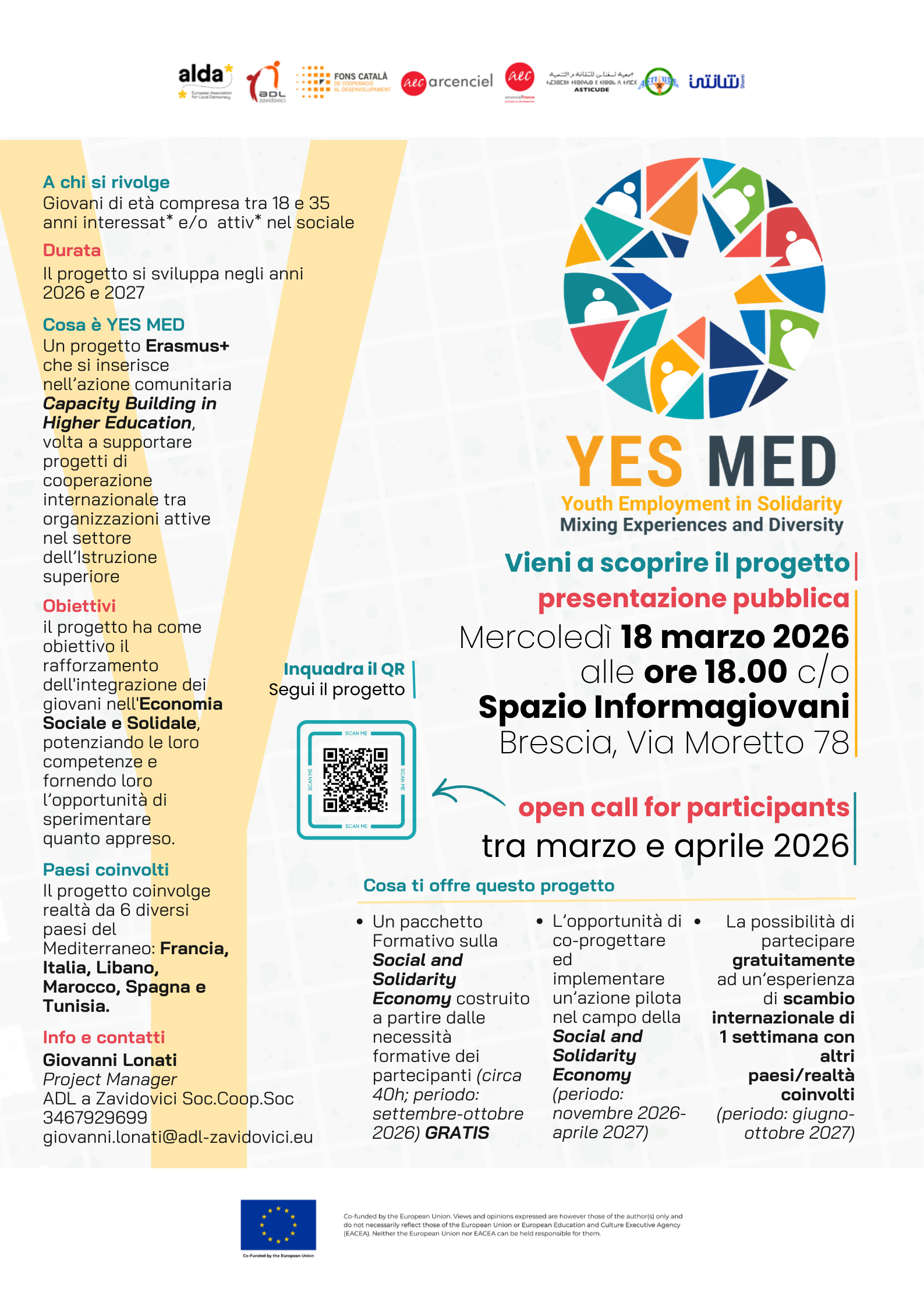 Il progetto si sviluppa nelle annualità 2026 e 2027 e ambisce al rafforzamento dell’integrazione dei giovani nell’Economia Sociale e Solidale, potenziando le loro competenze e fornendo loro l’opportunità di sperimentare quanto appreso.